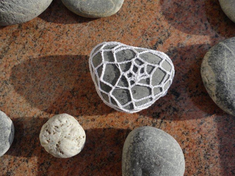 Ich wollte nämlich einmal einen Stein umgarnen bzw. umhäkeln. Zuerst ist das Blümchen (oben) entstanden und danach das Herz (unten)