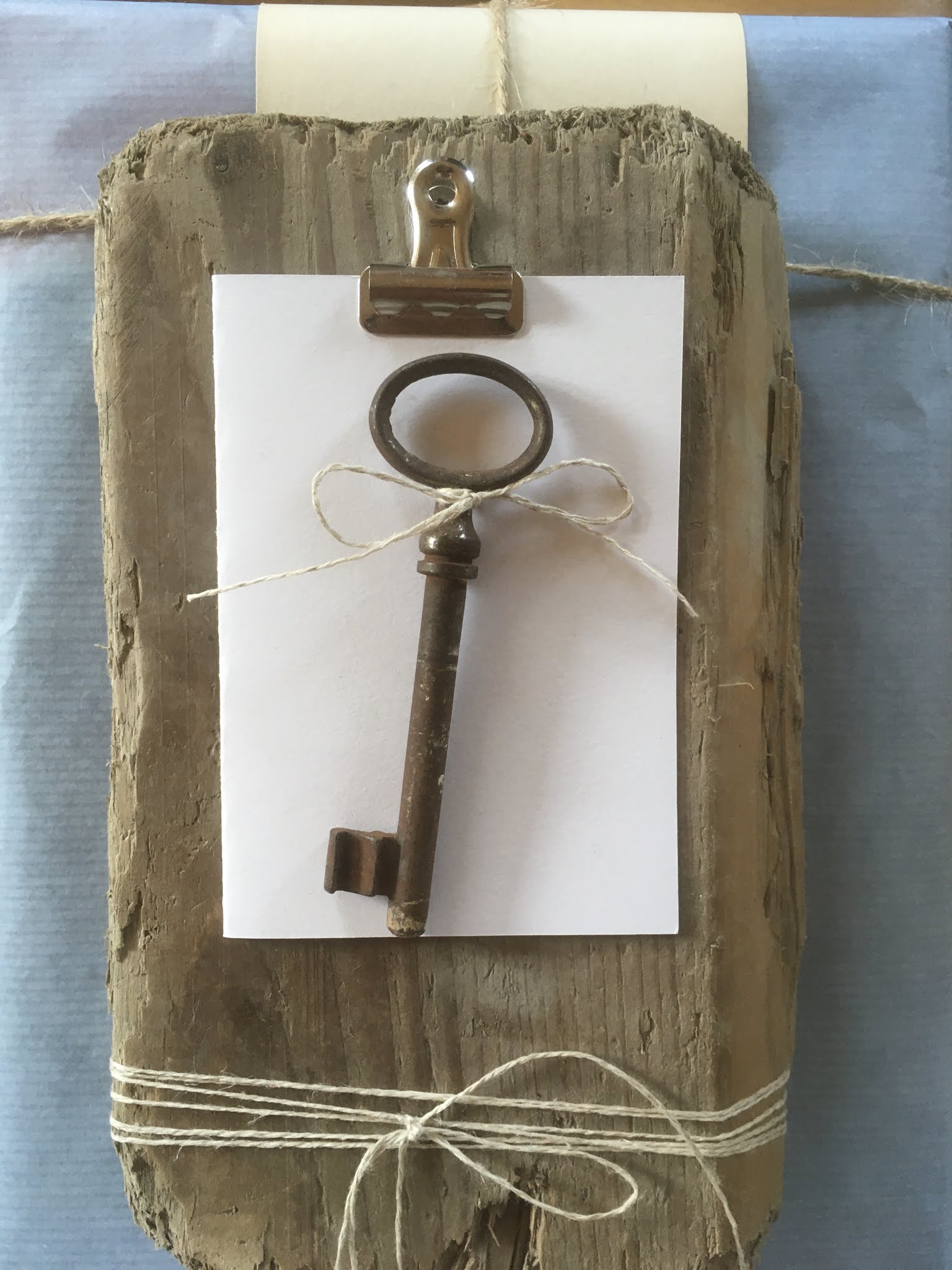 Mal eine andere Geburtstagskarte. Auf einem Stück alten Holz, eine Karte, ein alter Schlüssel und etwas Schnur.